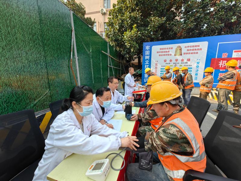 活动当天,在党员志愿者的引导下,团队兵分两组。一组为工人们提供免费量血压、测血糖、心电图检查、中医把脉、针灸等服务,询问务工人员的生活习惯和以往病史,根据检查结果提供个性化治疗建议及健康预防措施。另一组结合工地实际现场讲解职业病防治、春夏之际保健常识以及高血压、高血糖、高血脂等常见病的成因、症状、危害及预防措施等内容。