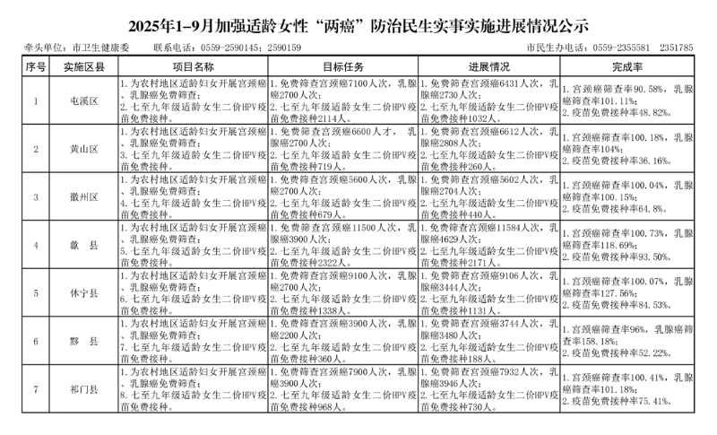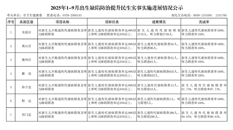 黄山市2025年1-9月卫生健康民生实事项目实施进展情况公示