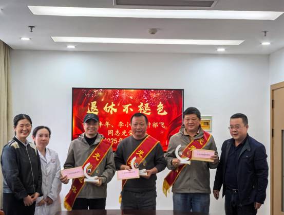 最后,中心领导为3名退休同志佩戴 “光荣退休” 绶带,颁发纪念奖章,全体与会人员共同见证这一光荣时刻,合影留念,定格属于疾控人的珍贵记忆。