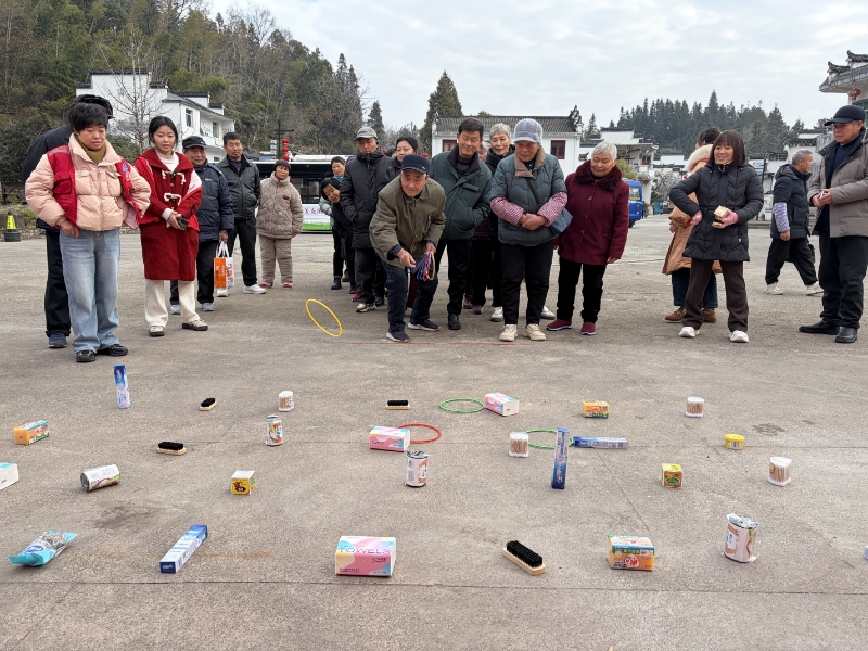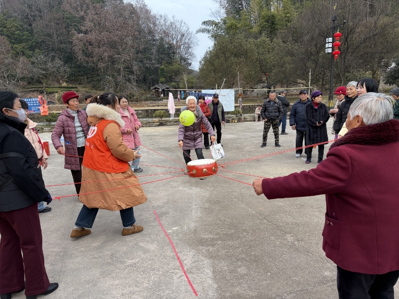 活动当天,志愿者早早到场布置场地,喜庆的装饰让现场暖意融融。简单开场之后,活动直接开始。在传承古徽文化环节,当地志愿者带着老人们参观了明代进士第、中宪第等徽派古建群历史遗迹和文旅景点,亲身感受徽州千年古村的底蕴。在趣味游戏环节,志愿者们设置了套圈、投壶、接力运球、击鼓颠球、蒙眼踏步走等简易小游戏,老人们踊跃参与,乐在其中,现场欢声笑语不断,获胜者还收获了精心准备的小奖品。小游戏结束,工作人员为每位老人送上精致的马年玩偶纪念品,并邀请大家一起合影,定格美好瞬间。几位老人还分享了自己的活动感受,大家纷纷表示感受到了浓浓的节日氛围和社会温暖。活动最后,极具徽州特色的杀猪饭环节温馨开启,老人们围坐一桌,品尝传统美食,在浓烈的氛围中感受年俗魅力。活动结束后,志愿者协助老人们有序登车返程,确保出行安全。