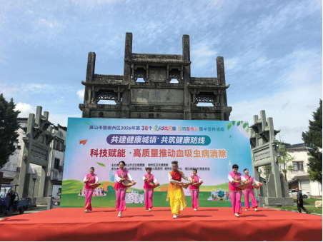 活动现场形式鲜活、内容丰富。区卫生健康委主任张仁财现场宣读第38个爱国卫生月倡议书,号召广大居民从自身做起,争当健康生活的践行者、公共卫生的守护人。文艺汇演精彩纷呈,舞蹈《摆出幸福来》、太极《八段锦》、斗笠舞《茶花谣》舒展灵动,原创快板《全区筑牢血防线 美好徽州幸福长》朗朗上口,把血防要点编成“土味金句”,赢得满堂喝彩。两轮有奖知识竞答穿插其间,居民争相举手抢答,在欢声笑语中把爱国卫生、病媒防制、血吸虫病防治等知识牢记于心。