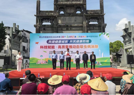 4月10日下午,徽州区2026年第38个爱国卫生月暨血防宣传周集中宣传活动在潜口镇金紫祠广场隆重举行。徽州区委常委、区政府党组成员、副区长张国强出席并致辞,市疾控中心主任邓国强、市卫生健康委爱卫与宣传科科长张静文、区卫生健康委主任张仁财、潜口镇党委副书记、镇长曹吉松,区卫生健康委副主任、区疾控局局长刘同心亲临现场。