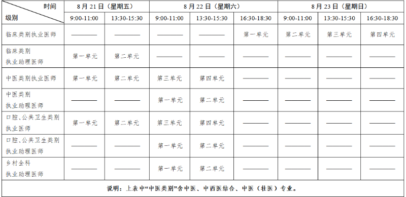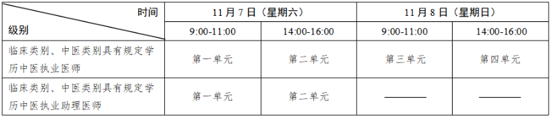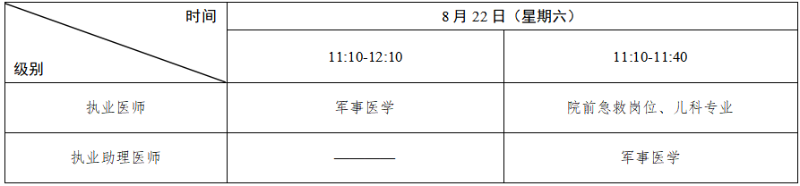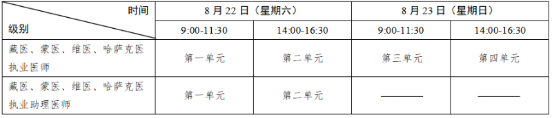 考试实行计算机化考试,军队现役人员、文职人员加试军事医学,院前急救岗位和儿科专业加试相应内容。中医类别藏医、蒙医、维医、哈萨克医专业实行纸笔考试。统一考试时间如下: