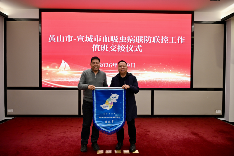 会议举行了2026年度血防联防联控值班市、县旗帜交接仪式。黄山市与宣城市、黄山市与池州市,以及歙县与绩溪县、祁门县与石台县、黄山区与泾县疾控中心之间完成了值班旗帜交接。