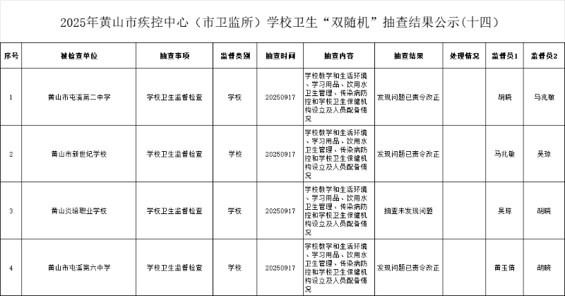 2025年黄山市疾控中心(市卫监所)学校卫生“双随机”抽查结果公示(十四)